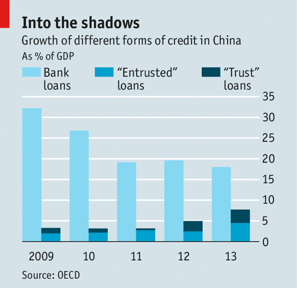 In China, shadow banks accounted for almost a third of the rise in lending last year, swelling by over 50% in the process in Figure 2. By offering returns, they raise money from businesses and individuals frustrated by the low cap the government imposes for interest rates on bank deposits. They lend to firms that are unable to borrow from banks with the curbs from the government.