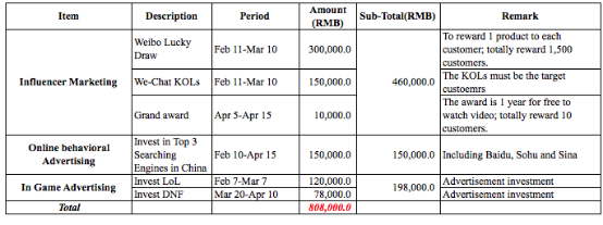 On the other hand, according to the analysis of business environment, it advised a digital marketing plan including Influencer marketing, online behavioral advertising and In-game advertising. Firstly in terms of influencer marketing, it contains 3 parts: Weibo lucky draw to win the products, We-Chat KOLs to drive the brand awareness and Grand award to burst the buzz in Weibo and We-Chat. Secondly in terms of Online behavioral advertising, the Storm Magic Mirror will invest the Top 3 Chinese searching engines including Baidu, Sohu and Sina. Finally in terms of In-game advertising, it contains two parts: the first part is to invest the came called LoL. It will start from Feb 7 and end on Mar 7. LoL got the largest players in China: by the end of 2015, the quantity of players was 30.2 million, and it equaled to 1.6% of Chinese population. The second part is to invest the game called DNF, which had 3.4 million.