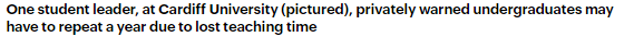 據(jù)英媒透露,卡迪夫大學(xué)的一名學(xué)生領(lǐng)袖私下警告道,由于損失的課時(shí)太多,有的本科生可能不得不重讀一年。