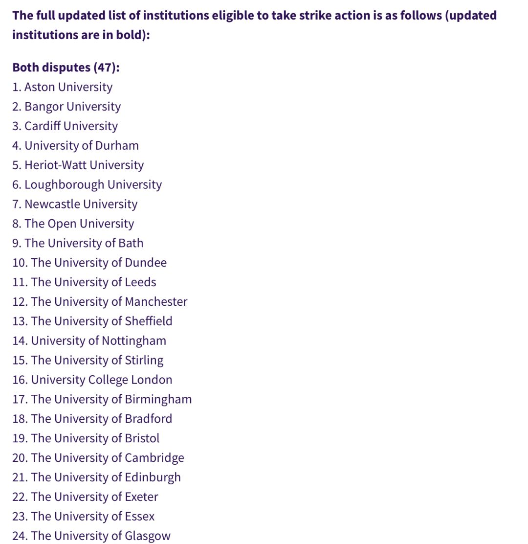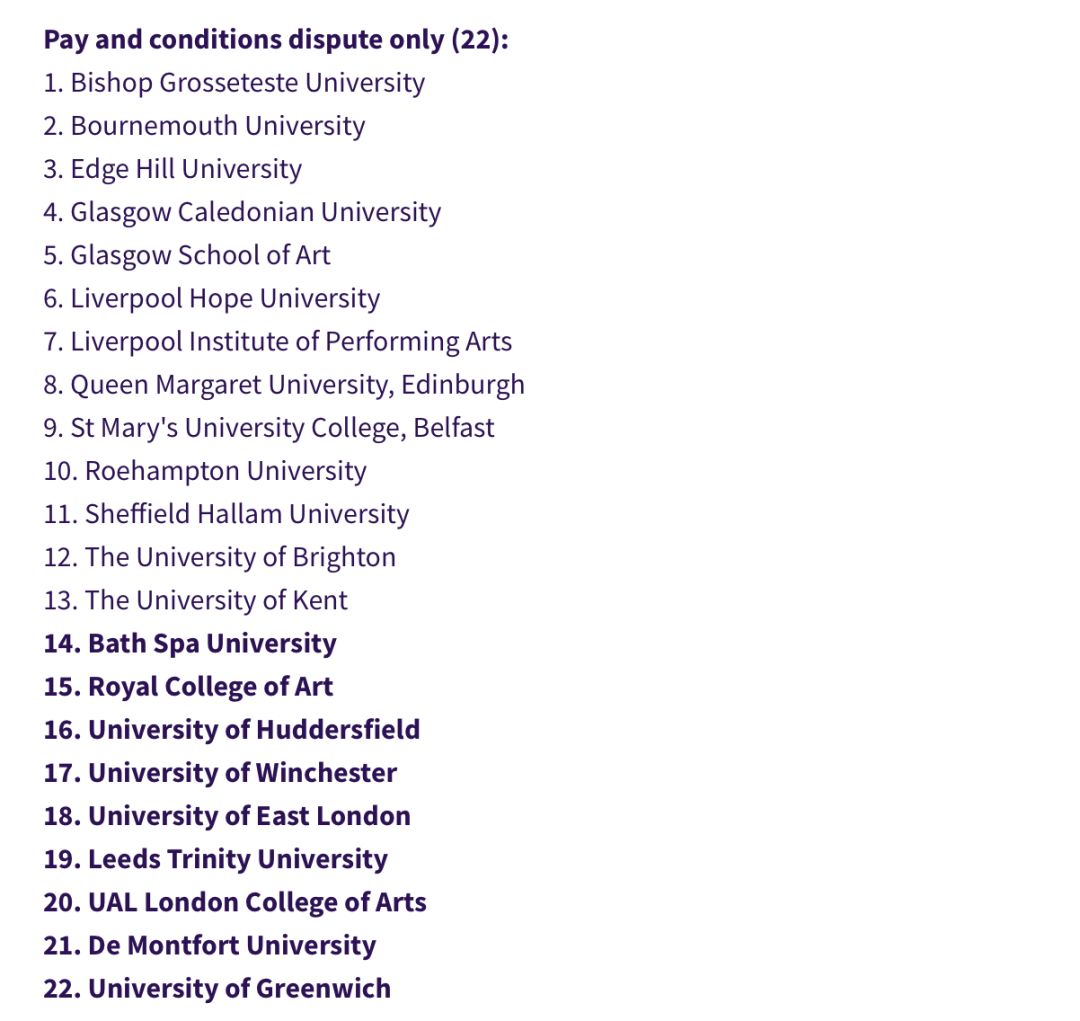 本次罷工活動(dòng)為期4周、總計(jì)14天,其中包括了牛津、劍橋、帝國理工、UCL、KCL、曼大、謝菲爾德、愛丁堡等在內(nèi)的74所英國大學(xué)!『其他參與罷工的學(xué)校名單見文末』