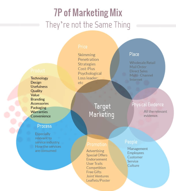 讓我們花點(diǎn)時(shí)間,借助下面的一張圖片,找出 4P 和 7P 之間的一些區(qū)別。通過這張圖片,你會(huì)很容易理解在營(yíng)銷組合中使用 4P 和 7P 的概念。
