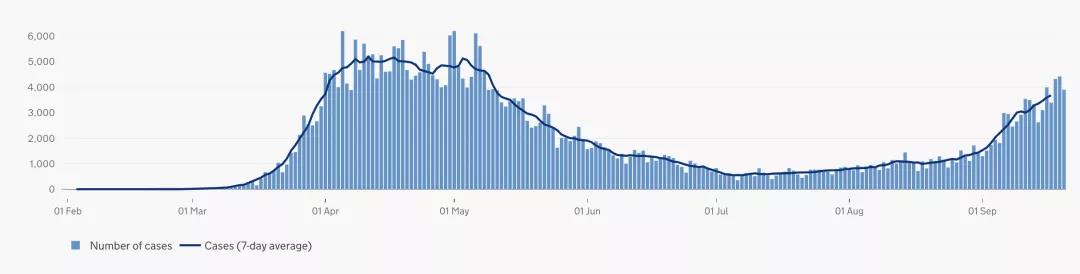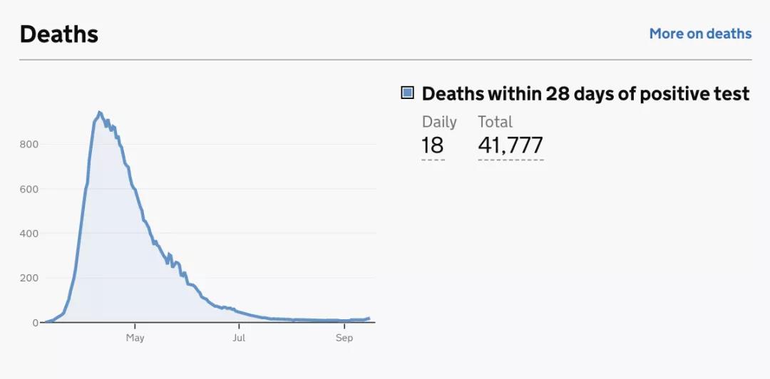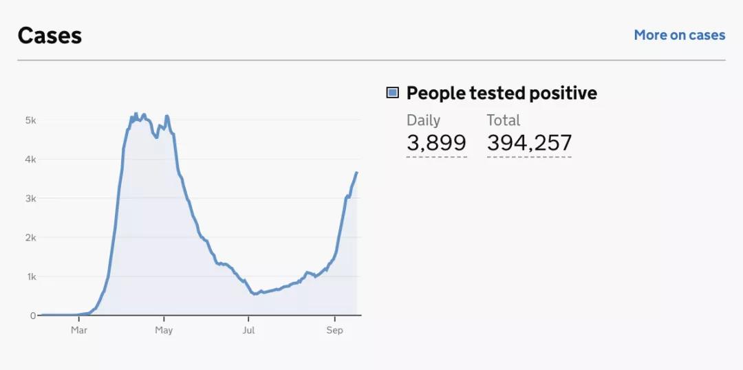 截止至2020年9月20日(周日)英國時間09:00,累計檢測結(jié)果量17,995,470次;累計確診394,257例(+3,899);累計病亡41,777例(+18)。