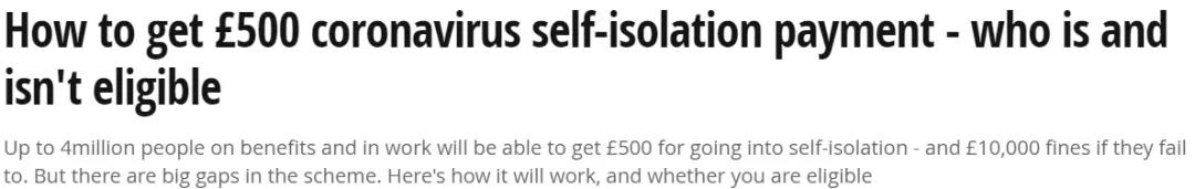 除了重罰,英國政府也對需要自我隔離的人拋出了甜頭。只要符合條件,需要自我隔離的人可以領(lǐng)到500英鎊補助。