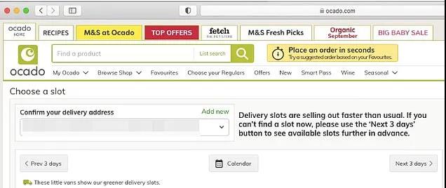 Tesco,Sainsburys'和Ocado已經(jīng)表示,很多客人已經(jīng)很難約上三天之內(nèi)的送貨時段了。