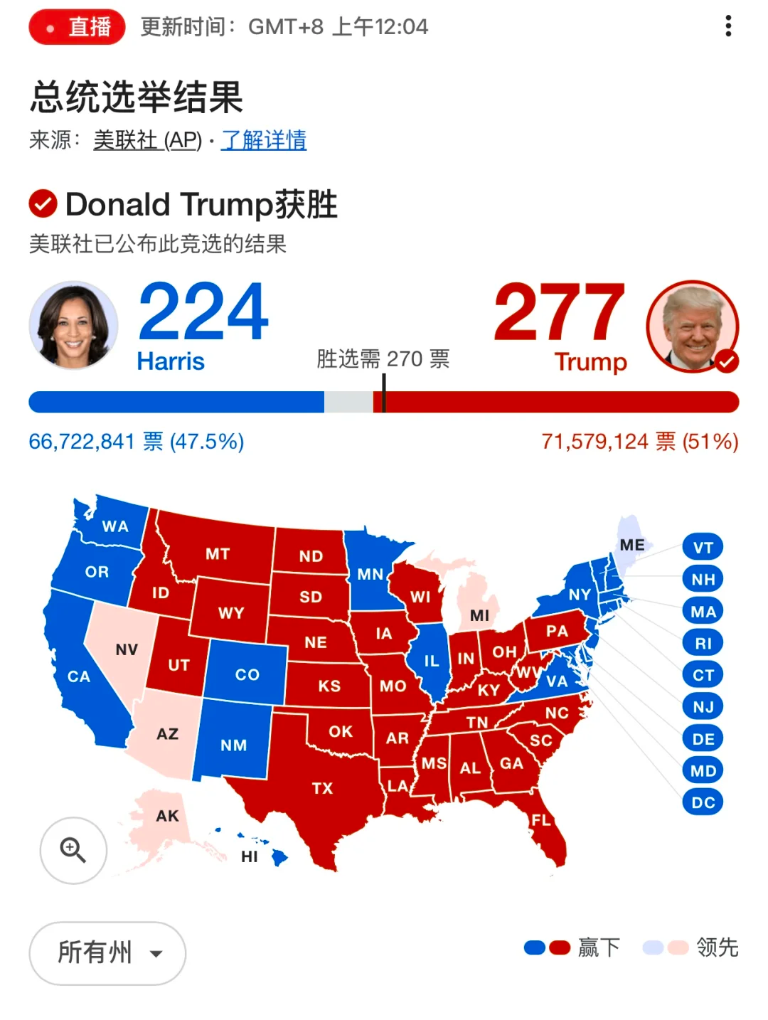 2024年度最大的懸念于11月6日終于塵埃落定——隨著美國總統(tǒng)選舉的選舉人票不斷開出,特朗普率先斬獲了超過270張選舉人票,這一結果標志著特朗普成功贏得了2024年美國大選。
