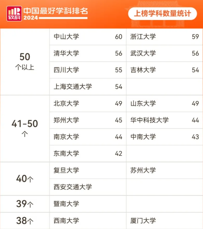 中山大學(xué) 60 個(gè)學(xué)科上榜居首,學(xué)科體系較為完備。