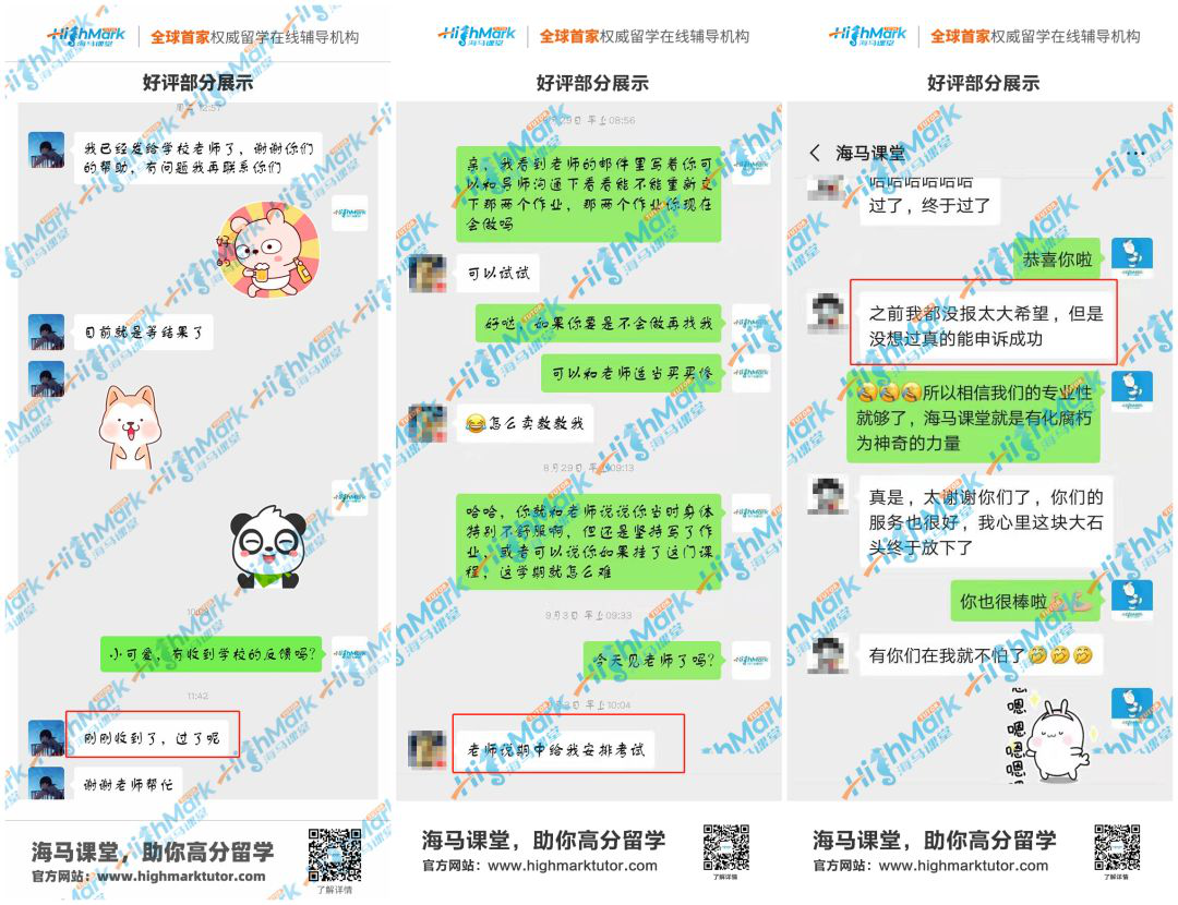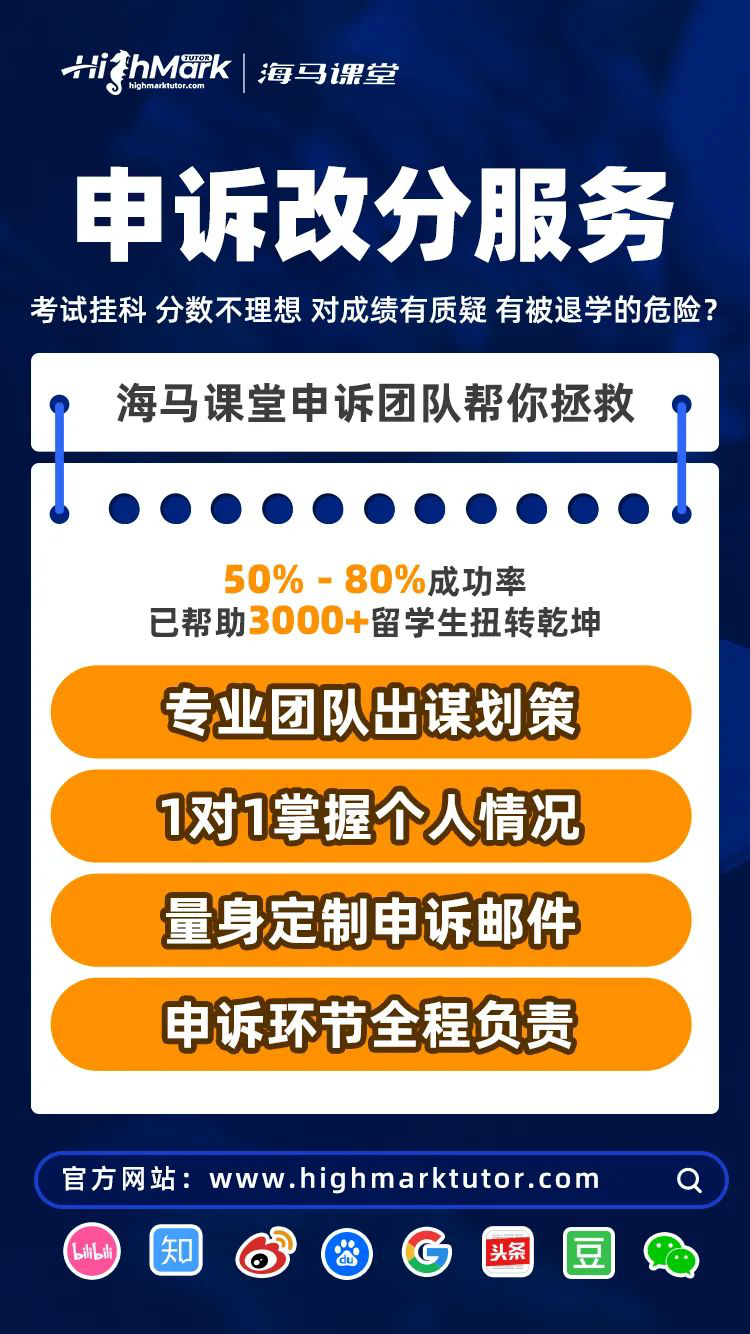 為了增加Appeal成功的幾率,同學(xué)們可以在第一時間咨詢海馬課堂的學(xué)習(xí)規(guī)劃師哦,我們有專業(yè)的精英導(dǎo)師團隊,會針對每一名學(xué)生的具體情況為同學(xué)們量身定制申訴服務(wù),幫助同學(xué)們繼續(xù)學(xué)業(yè)。