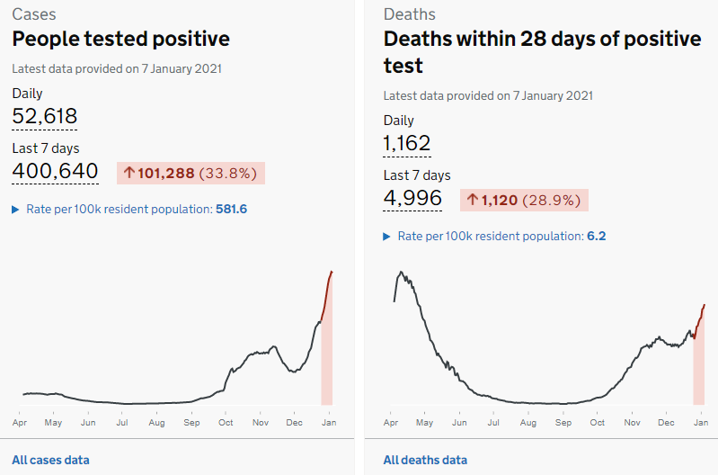 今天我們來繼續(xù)關(guān)注今日的英國疫情速報。根據(jù)英國時間1月7日下午新出的數(shù)據(jù),英國新冠總確診人數(shù)為2,889,419,單日新增確診人數(shù)為52,618人,單日新增死亡人數(shù)為1162人。這是自去年四月以來,單日新冠死亡人數(shù)連續(xù)第二天破千。