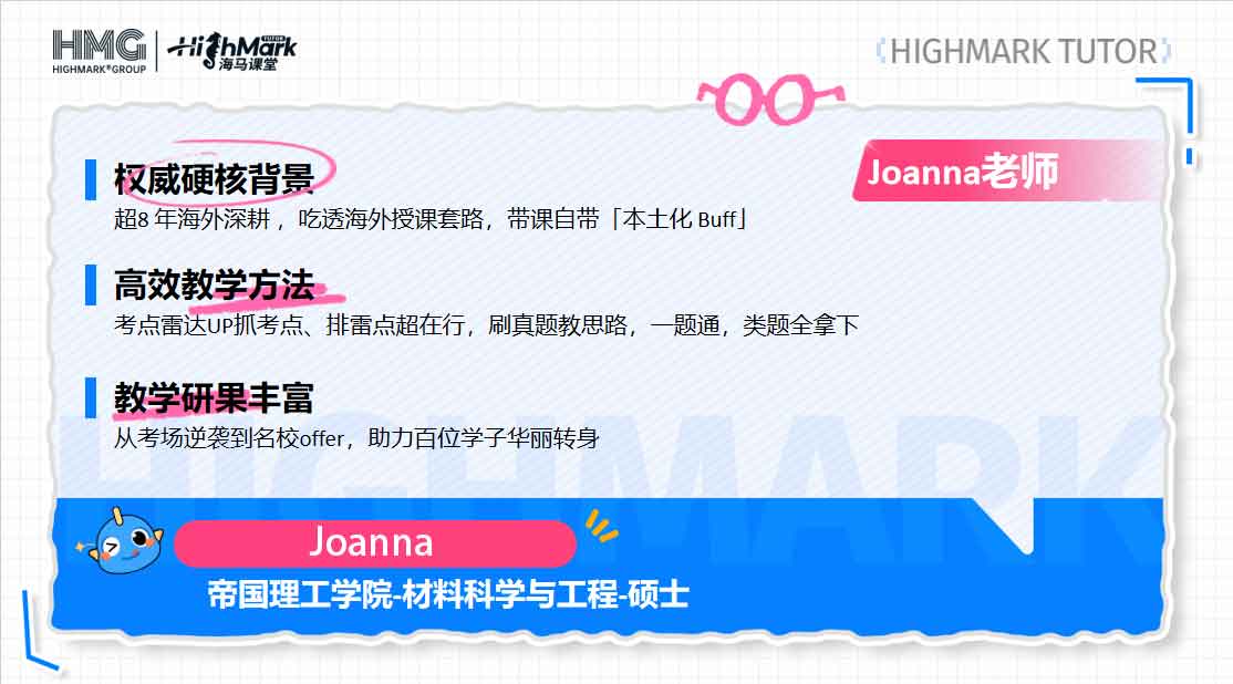 教學(xué)優(yōu)勢:本碩均就讀于帝國理工學(xué)院,學(xué)術(shù)功底過硬。注重細(xì)節(jié)打磨與嚴(yán)格把關(guān),能在學(xué)習(xí)的每個階段提供專業(yè)反饋,并耐心傾聽學(xué)生的學(xué)習(xí)困惑,給予針對性指導(dǎo)。