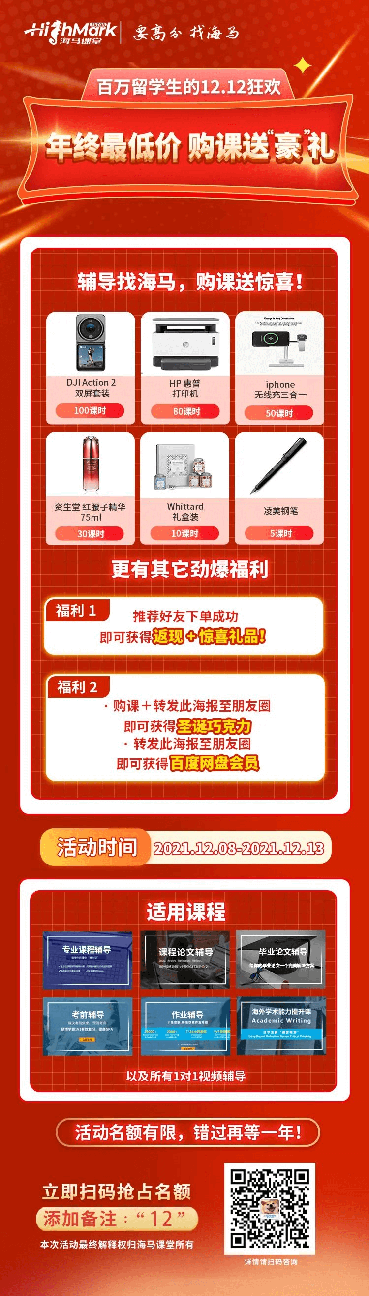 此次活動(dòng)設(shè)置課程完美解決了留學(xué)生的各種課業(yè)煩惱,從根本上解決你的學(xué)業(yè)焦慮。涵蓋課程輔導(dǎo)、課程論文輔導(dǎo)、畢業(yè)論文輔導(dǎo)、考前輔導(dǎo)、作業(yè)輔導(dǎo)、海外學(xué)術(shù)能力提升輔導(dǎo)。