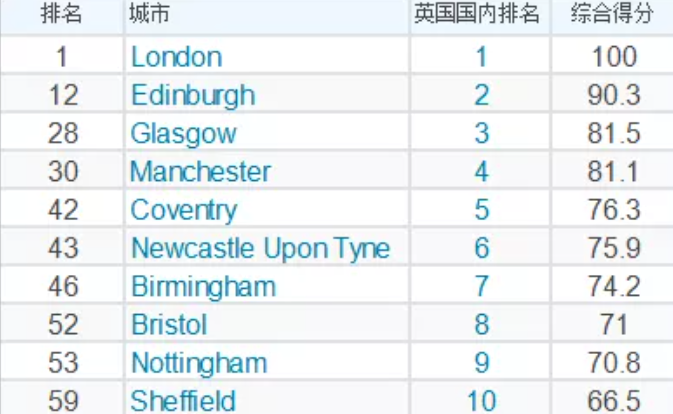 根據(jù)這六大項指標,算出的2022年英國最佳留學城市前十名為: