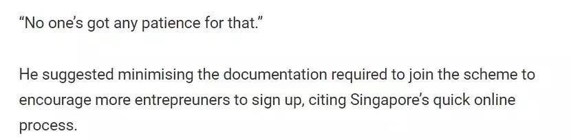 還有人建議盡量減少加入該計(jì)劃所需的文件,以鼓勵(lì)更多的企業(yè)家注冊(cè),并引用新加坡的快速加入流程。