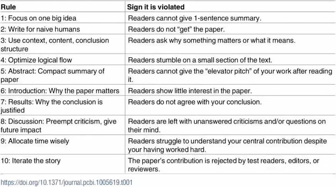 作為一個(gè)作者,如果你不能夠在幾分鐘之內(nèi)向你的同事描述出論文的整體大綱,那么很明顯讀者也無(wú)法做到。你需要進(jìn)一步提煉你的故事。找尋到此類違反優(yōu)秀寫作的行為對(duì)從各個(gè)層次提高論文質(zhì)量十分有益。