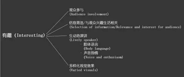· 觀眾參與(Audience involvement):有互動和交流,除了眼神交流,還可以通過提出或回答問題與觀眾互動